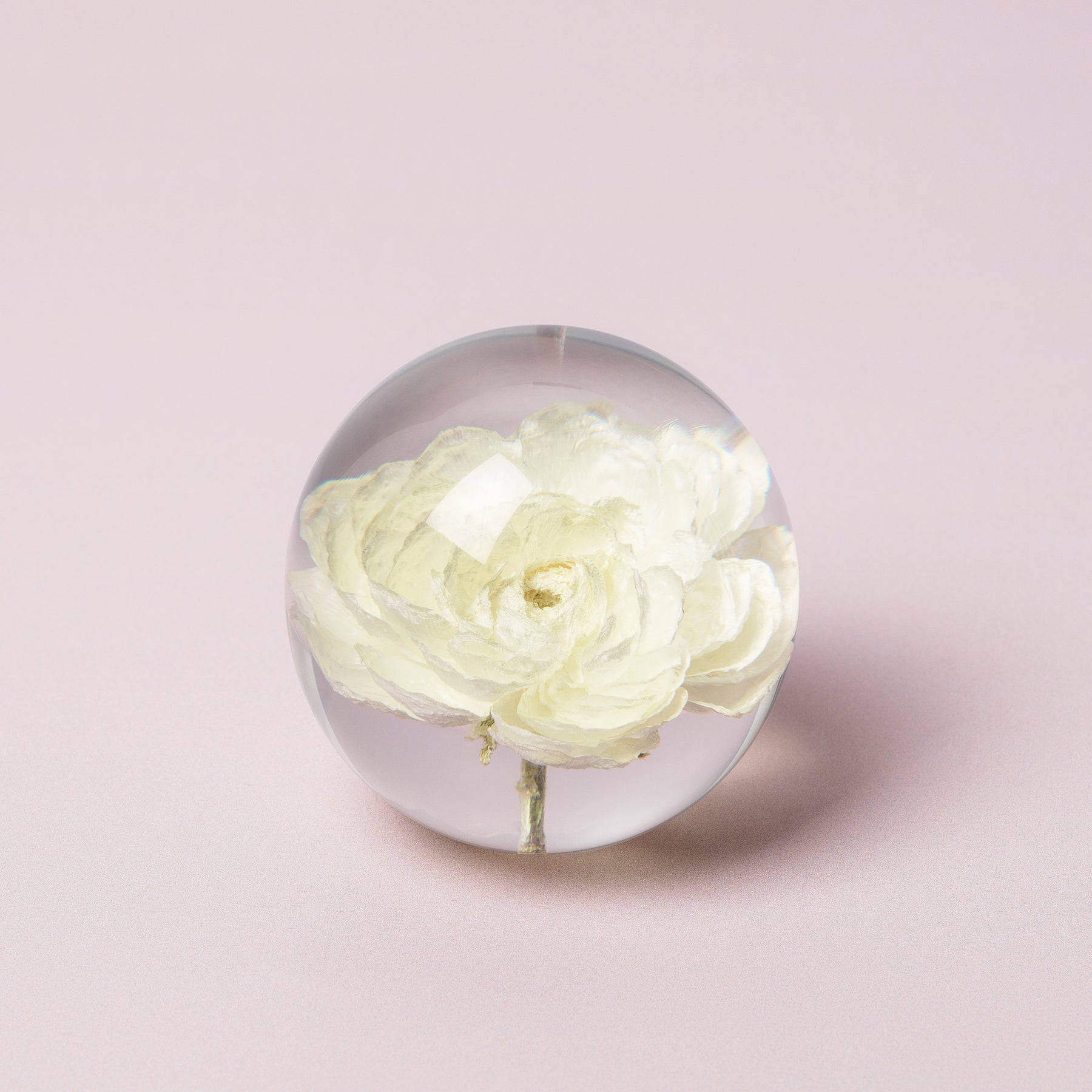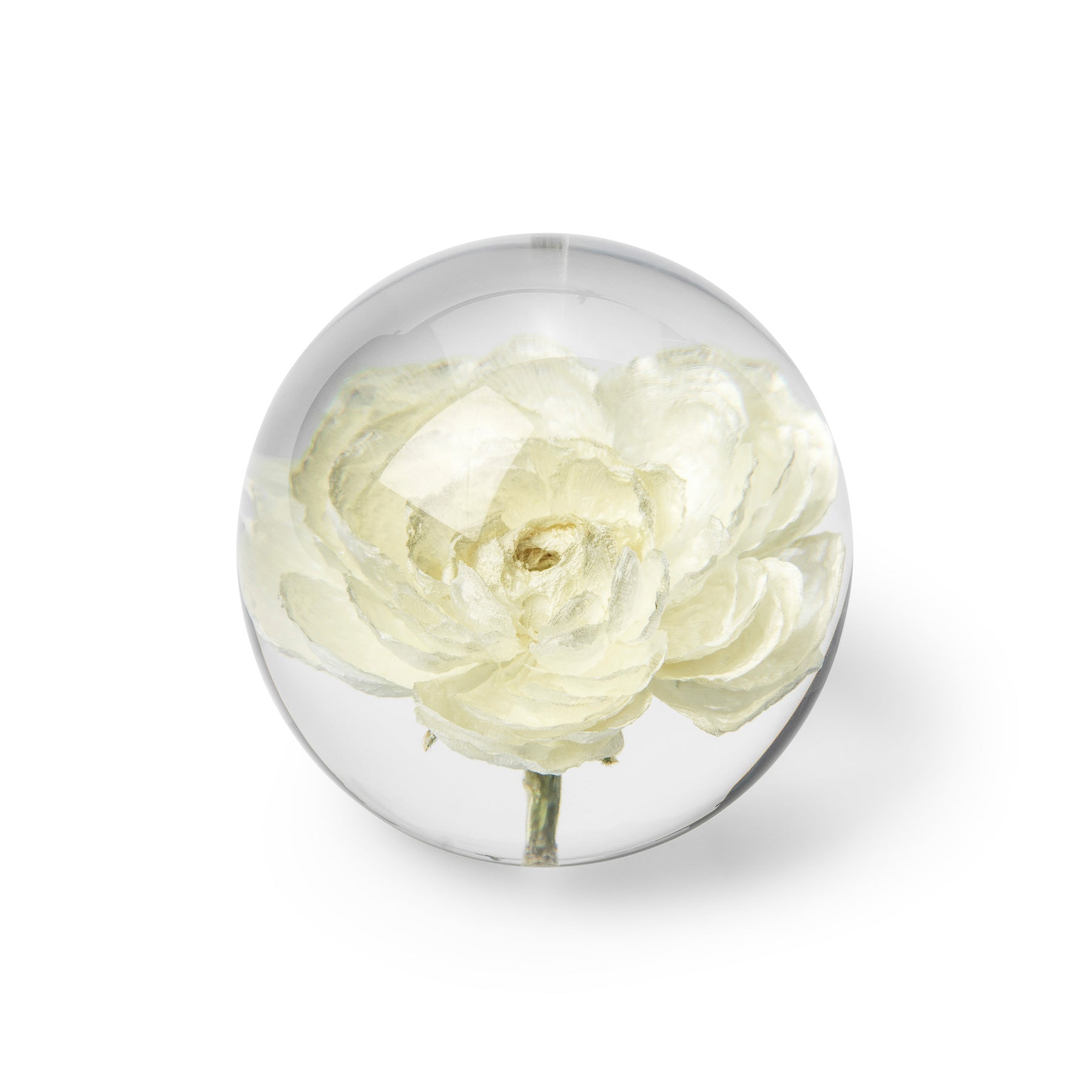 Beautiful In Flore Peony Rose "Ranunculus" paperweight featuring a white peony rose ranunculus flower. The paperweight is made from crystal resin with a real ranunculus flower moulded inside.